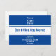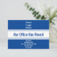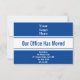 En haut, il y a une image d'affichage que vous pouvez remplacer par le logo de votre entreprise. Au centre, il y a un texte d'affichage bleu foncé pour un message personnalisé (affiché : Notre bureau a déménagé). En bas, il y a des lignes de texte d'affichage que vous pouvez modifier pour partager la nouvelle adresse. La carte est bleu foncé et blanc.