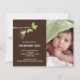Notre petit singe est arrivé annonce de naissance de bébé garçon est un doux moyen d'annoncer à votre famille et à vos amis que votre petit chéri est arrivé. La carte d'annonce de photo présente le plus mignon petit singe suspendu à une branche d'arbre sur un fond marron avec un accent à pois. Ajoutez votre photo et vos informations et vous êtes prêt à partir ! ©cocoa studio