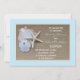 Ce faire-part d'élévation est illustré d'une photo d'un coquillage, d'un dollar d'étoiles de mer et de sable sur un arrière - plan de burlap. La photo est entourée de blanc, pêche et bleu. Ce faire-part d'élopement peut être customisé pour inclure vos détails d'elopement. Copyright henishouseo