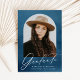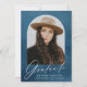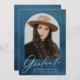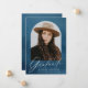 Élégant faire-part de graduation avec la photo du diplômé à l'intérieur d'une arche avec un arrière - plan bleu marine aquarelle. "Graduate" est affiché dans un script de calligraphie moderne blanc avec le nom du diplômé, l'école, et l'année d'études montré ci-dessous. La faire-part de graduation de la photo s'inverse pour afficher un arrière - plan d'aquarelle marine correspondant avec de l'espace pour du texte et des photos supplémentaires.