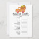 Le thème de l'automne mignon comporte un citrouille, une carte de mots pour le baby shower Les mots sur cette carte sont tous liés aux bébés et ont été brouillés. Les invités se disputeront pour voir qui pourra les débrouiller en premier ! RÉPONSE CLÉ : 1. siège de voiture; 2. lait 3. stylo 4. sucette Le cinquième article est une chaise à bascule. 7. garderie 8. surveillance de bébé; 9. enrouler 10. formule. 11. canard en caoutchouc 12. poussette. 13. surveillance. 14. ensemble. 15. Thermomètre.