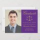 Envoyez à votre famille et à vos amis une carte de diplôme d'avocat personnalisée pour les wow. Ce design modèle présente votre photo personnalisée à gauche et à droite une fausse balance or de justice avec le mot Graduate, classe/année, nom, diplôme et autres détails de cérémonie pour personnaliser sur un arrière - plan violet classique. Conçu par Susan Coffey.