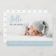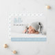Carte faire-part de naissance simple et moderne avec un modèle photo avec un texte superposé en fontes bleu pastel et gris foncé qui lit Bonjour, je suis Jackson (personnalisable avec le nom de votre bébé). La bande bleu clair de la partie inférieure est personnalisable avec les statistiques de naissance en lettres blanches. Le dos de la carte est muni d'un mignon motif bleu clair