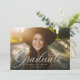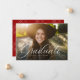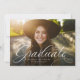 Un script classique et élégant, diplômé en blanc, se trouve au bas d'une photo horizontale. Le texte personnalisé comprend la place pour le nom du diplômé ainsi que les détails de l'école et de l'année. Le dossier rouge classique a un simple motif de grille, et la couleur peut être changée en cliquant sur "customiser plus loin". Annoncez la réalisation de votre diplômé à vos amis et à votre famille avec ce design!