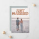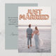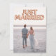 Cette annonce de mariage personnalisée présente un design photo personnalisé amusant et romantique. La phrase "Just Married" est imprimée en haut sur des ballons en feuille de rose gold. Une photo d'exemple d'une mariée et d'un marié couvre le fond que vous pouvez personnaliser pour inclure votre propre photo du couple marié, ou une autre image de votre choix. Une annonce de mariage type du couple de jeunes mariés est imprimée au verso.