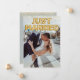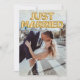 Ce faire-part de mariage personnalisé est doté d'un design photo personnalisé amusant et romantique. L'expression "Just Married" est imprimée sur le dessus en ballons en feuille d'or. Un exemple de photo d'une mariée et d'un marié couvre l'arrière - plan que vous pouvez personnaliser pour inclure votre propre photo personnalisée du couple marié, ou une autre image de votre choix. Les confettis de parties scintillant d'or accentuent les parties supérieure et inférieure. Un exemple de message de faire-part mariage est imprimé au verso.