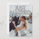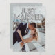 Cette annonce de mariage personnalisée présente un design photographique personnalisé amusant et romantique. La phrase "Just Married" est imprimée en haut en ballons en feuille d'argent. Une photo d'exemple d'une mariée et d'un marié couvre le fond que vous pouvez personnaliser pour inclure votre propre photo personnalisée du couple marié, ou une autre image de votre choix. Des confettis pailletés argentés accentuent les parties supérieure et inférieure. Un exemple de message d'annonce de mariage est imprimé au dos.