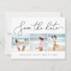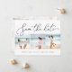 *Available for digital download* A modern coastal style save the date postcard designed to accommodate three square photos aligned side by side, with "save the date" across the top in chic handwritten script lettering. Personalize with your names, wedding date and wedding location beneath. Postcards reverse to show additional save the date details, including your wedding website, with your return address and space for recipient addressing. A transparent background pattern of seashells and coral adds beachy appeal.