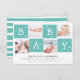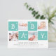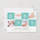 Une carte de faire-part pour bébé mignon pour informer la famille et les amis de la naissance de votre bébé magnifique. Avec 4 photos carrés, 4 blocs de couleur turquoise carrés avec un texte blanc amusant qui explique le mot 'BABY', mignonnes petites étoiles blanches éparpillées et votre nom de bébé et statistiques de naissance. Toutes les polices et les couleurs sont facilement customisées.