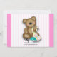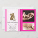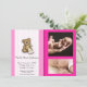 Ce design pour bébé est une façon précieuse d'accueillir et d'annoncer votre nouvelle offre de joie! Ce design est composé d'un arrière - plan rose clair avec un motif rayé blanc et rose à gauche. À droite, il y a un cadre bordé de rose foncé pour deux de la photo de votre bébé. Sur le côté gauche se trouve un joli ours en peluche brun tenant une couverture bébé. Ci-dessous, il y a une place pour les détails de naissance et un message personnel.