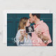 Photo Overlay Bientôt être trois Faire-part de grossesse personnalisées. Offrez la grande nouvelle pour votre nouveau membre de la famille en route avec un carte photo personnalisé avec votre propre photo et un script de superposition Bientôt être Trois et texte personnalisé sur le devant. Le dos est un motif x géométrique moderne en moutarde et blanc.