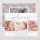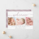 Annoncez l'arrivée de votre bébé fille avec cette annonce de naissance moderne recto-verso. Le recto présente un collage de trois photos de vos photos préférées et « Bienvenue » dans un script manuscrit mauve poussiéreux. Personnalisez avec le nom de votre bébé, la date de naissance, les statistiques de naissance et les noms des parents.
