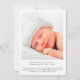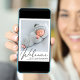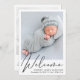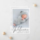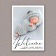 Une faire-part de naissance simple et élégante avec la photo de votre nouveau-né superposée avec "Bienvenue" dans un script élégant. Ajoutez le nom, la date de naissance et les statistiques de naissance de votre bébé. Au dos, ajoutez une autre photo et un message personnalisé.