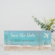 Carte d'embarquement billet d'avion destination mariage enregistrer la carte de date avec un arrière - plan de plage de sable et d'eau turquoise. Avion avec des couleurs de coeur et de texte sont tous modifiables dans le concepteur avancé afin que vous pouvez concevoir votre propre thème de voyage enregistrer la date pour votre mariage de destination de plage.