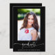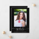 Moderne Elegant Script Graduation Photo avec un élégant script manuscrit avec une photo de taille sur le devant et une photo carré sur le dos, le tout sur un arrière - plan noir moderne, mais tous le texte et les couleurs sont entièrement personnalisables - parfait pour vos annonces de graduation élégantes simples.