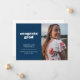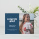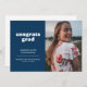 Annoncez la grande réussite de votre diplômé avec cette faire-part de graduation simple mais élégante. Il comporte les mots "grad de félicitations" dans une police de style rétro blanc sur un arrière - plan bleu foncé ainsi que des espaces pour une photo à la fois devant et derrière. Le dos de la faire-part offre également un espace pour une note personnelle sur le diplômé, y compris les plans futurs.