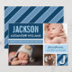 La carte d'annonce de naissance photo moderne et audacieuse présente le prénom du bébé garçon en caractères surdimensionnés sur un bloc de couleur bleu marine avec des bandes diagonales, les informations de naissance sur une bannière bleue nuageuse et deux photos sur le devant. Le dos présente une mise en page en grille avec une troisième photo, un message "Parents fiers" et une initiale monogramme sur un bloc rayé. Le bleu marine, le bleu nuageux, le bleu clair et le blanc créent une palette de bleus tonals saisissante. Toutes les couleurs et le texte sont entièrement personnalisables.