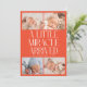 Modern Christmas theme birth announcement card featuring a bold typography text that says "a little miracle arrived" with 4 of your newborn pictures. This is a birth announcement card for the holiday seasons! Add your pictures, birth stats, and a message! The background is red.