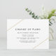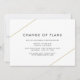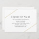 Carte de remise géométrique moderne mariage avec deux lignes d'or, l'une en haut à gauche et l'autre en bas à droite avec le titre "Changement de plan" sur un arrière - plan blanc. Un design minimaliste qui reste chic et design. Ces cartes de faire-part sont une excellente façon de faire savoir à vos invités que votre mariage a été reporté.