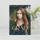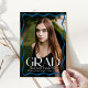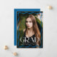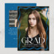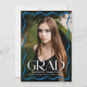 Célébrez votre diplôme d'études secondaires ou collégiales avec cet élégant faire-part de graduation, avec une photo verticale à fond de sang encadrée par une bordure bleu ondulée élégante. La lettre blanche grise "Grad" fait une déclaration, tandis que le nom, l’école et l’année de classe du diplômé ajoutent une touche personnelle. Le dos présente une photo horizontale avec espace pour un message personnalisé, ce qui en fait le moyen idéal de partager cette étape spéciale avec la famille et les amis.
