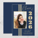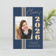 Cette classe de 2024 élégante faire-part de graduation élégante comprend des rayures d'or, cadre photo et texte sur un arrière - plan bleu marine.