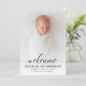 Faire-part de naissance moderne noir et blanc avec photo verticale personnalisée. Le mot "bienvenue" apparaît dans un élégant script de calligraphie noire avec des swashes au début et à la fin. Ajoutez le nom de votre bébé, ainsi que la date de naissance, l'heure, le poids et la longueur, en caractères noirs sans serif. Un filtre à dégradé allège la partie inférieure de la photo pour aider à faire apparaître le texte. Remplacez facilement l'exemple d'image par votre photo préférée de votre nouveau-né. Le dos de la carte est orné d'un motif à rayures noir et blanc. Idéal pour les garçons et les filles.