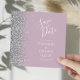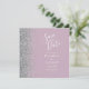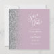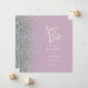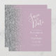 Le bord gauche de cet élégant mariage moderne, à l'exception de la carte de date, comporte une bordure en faux parties scintillant argent. Le texte personnalisable combine écriture gris argenté, copperplate et polices italiques sur un arrière - plan lilas poussiéreux. L'envers présente un design lilas et argenté assorti.