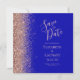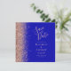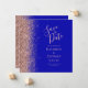 Le bord gauche de cet élégant mariage moderne, à l'exception de la carte de date, est orné d'une bordure en faux parties scintillant en or rose. Le texte personnalisable combine écriture rose couleur or pâle blush, cuivre et polices italiques sur un arrière - plan bleu royal. L'envers est assorti d'un bleu royal et d'un or rose.