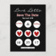 Carte postale de mariage interactive Save The Date conçue comme une carte à gratter de loterie. Réalisée en noir, rouge et blanc, avec un texte graphique en haut et des cœurs rouges, vous personnalisez les informations de mariage que vos invités doivent gratter puis ajoutez vos propres autocollants à gratter ronds. (non vendu par Zazzle) Le verso de la carte postale comporte des champs de texte personnalisés. Quelle façon amusante d'annoncer vos plans de mariage à l'avance.