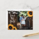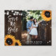 Cartes postales photo d'annonce de date de mariage florales rustiques avec des tournesols et des guirlandes lumineuses sur un fond en bois de grange. Conception de carte idéale pour une fête de mariage champêtre rustique inspirée des tournesols. Carte postale d'annonce de date de mariage avec monogramme.