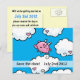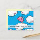 Une carte postale de "Save the Date" joyeuse prouvant que les porcs volent et que les rêves peuvent devenir réalité. Un petit cochon rose heureux danse sur des nuages ornés de cœurs sur un fond bleu. Sous le cochon, il est écrit "Save the Date" et vous avez la possibilité de personnaliser à la fois le recto et le verso de la carte postale.