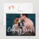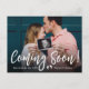 Cartes postales d'annonce de grossesse photo à venir. Parents futurs ! Typographie manuscrite blanche moderne "À venir !" carte pour partager votre bonne nouvelle avec la famille et les amis. Caractéristiques d'un script manuscrit blanc, empreinte de pied de bébé (ou empreinte) et photo complète. Vous pouvez personnaliser le design en remplaçant le texte d'exemple et la photo horizontale. #3343 Si vous avez besoin d'aide ou d'articles correspondants, veuillez me contacter !