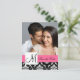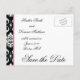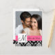 Élégante carte postale d'annonce de mariage avec motif damassé vintage noir et blanc et photo de fiançailles avec accent de couleur rose. Envoyez vos annonces de fiançailles à vos invités de mariage avec cette belle carte postale, en la personnalisant avec votre photo de fiançailles, monogramme initial, noms de la mariée et du marié, et date du mariage. Conception par Elke Clarke © Graphiques et photo d'exemple sous licence d'utilisation.