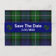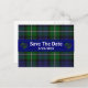 Mariage élégant enregistrer la carte de poste de date faite dans l'arrière - plan traditionnel Forbes vert et bleu tartan plaid. Une bande bleue traverse le milieu de la carte décorée de deux coeurs plaid, de chaque côté du texte blanc. Tout le texte, sur la bande avant et à l'arrière de la carte, est entièrement personnalisable pour lire ce que vous voulez.