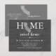 Faire-part moderne maison douce mobile avec l'état de CALIFORNIA mis sur un arrière - plan burlap gris. Retournez notre carte postale pour voir un retour personnalisable pour une touche spéciale supplémentaire.