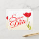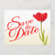 Belle tulipe rouge unique et lumineuse sur fond de couleur crème rustique, invitation de mariage 'save the date' informelle. Personnalisez cette invitation avec vos propres mots. Invitation simple, moderne et romantique, idéale pour un mariage printanier ou à thème de fleurs de tulipes. Conception et peinture de tulipe à l'aquarelle par Sarah Trett.