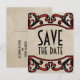 Élégante et chic carte postale de sauvegarde de date de mariage avec des tourbillons gothiques sur un fond beige texturé faux vintage et des bordures fleuries en rouge foncé. Ce design d'apparence antique est parfait pour annoncer votre mariage gothique ou vintage. Facile à personnaliser, il suffit d'ajouter vos coordonnées de mariage dans les champs de texte fournis. Cliquez sur "Personnaliser" pour trouver plus d'options de personnalisation.
