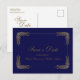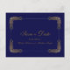 Une carte postale élégante et personnalisable avec ornement or et bleu pour annoncer la date de votre mariage.