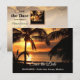 Une carte postale romantique Enregistrer la date représentant un coucher de soleil doré sur une plage tropicale avec des palmiers. Beau pour une destination tropicale prévue ou un mariage sur la plage.