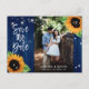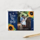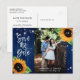 Cartes postales photo 'Évitez le Date' pour mariage floral rustique avec tournesols et guirlandes lumineuses sur fond de bois de grange. Conception de carte idéale pour une fête de mariage rustique bleu marine inspirée des tournesols. Carte postale 'Évitez le Date' avec monogramme pour mariage.
