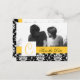 Carte postale jaune de sauvegarde de date avec motif damassé noir et blanc et photo de fiançailles. Conception de la mise en page de la carte postale de sauvegarde de date par Elke Clarke©. Graphiques sous licence. Personnalisez cette carte élégante de sauvegarde de date de mariage avec vos informations personnelles et votre palette de couleurs de mariage.