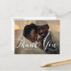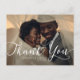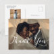 Un mariage horizontal simple et élégant vous remercie carte postale modèle avec un texte de typographie écrit à la main qui indique du Merci sur votre image avec vos noms et votre date de mariage. Au fond, il y a un message (il est modifiable !) avec une deuxième photo. Express votre gratitude avec style!