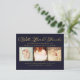Écriture cursive élégante en faux feuillet d'or sur le devant de cette carte postale bleue marine de créateur sur laquelle vous ajoutez vos propres portraits de photos de bébé. Contient 3 photos de bébé. Personnalisez facilement et rapidement cette carte postale de créateur imprimée professionnellement "merci" et "SIP et voir" ici et maintenant en tapant simplement sur le texte d'exemple et en ajoutant vos propres photographies. Élégante, chic, simple et élégante typographie en or script/cursive.