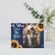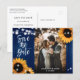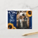 Cartes postales photo de sauvegarde de date de mariage florales rustiques avec des tournesols et des guirlandes lumineuses sur un fond de bois de grange. Idéal pour la conception de carte pour une fête de mariage rustique bleu marine inspirée par les tournesols.
