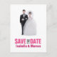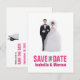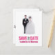 Si vous aimez le kitsch, mais que vous êtes définitivement moderne, c'est une excellente carte postale pour annoncer la date de votre mariage qui pourrait vous faire sourire. Une figurine de gâteau de mariage rétro est représentée sur le devant, mais le texte est tout à fait contemporain. Les détails personnalisés de votre événement sont au verso. Disponible en couleurs alternatives avec des produits assortis.
