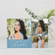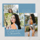 Carte de photo d'annonce de remise de diplôme moderne et fantaisiste avec 3 photos sur le devant et 1 au dos. Le texte dit "célébrant le diplômé" en police de caractères cursive. Ajoutez le nom du diplômé, les informations et le message pour personnaliser cette carte. Bleu denim.
