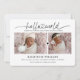 Carte de naissance chic et moderne avec 2 photos à l'avant et 4 photos à l'arrière de la carte. Écriture "hello world" liée avec un cœur. Typographie moderne et classique.