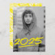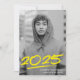 Faire-part moderne de graduation avec la photo verticale du diplômé avec "2023" en lettres manuscrites jaune vif avec un tiret ci-dessous. Personnalisez le faire-part tendance de remise de diplômes en photo en ajoutant le nom du diplômé et le nom de l'école. La classe de 2023 faire-part de graduation s'inverse pour afficher un motif de coups de pinceau jaunes et blancs.