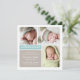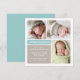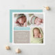 Partagez votre bonne nouvelle avec cette carte d'annonce de naissance moderne aux blocs de couleur aqua et taupe. Une bannière sarcelle "Introducing" ancre la mise en page carrée épurée, avec une typographie de nom script et serif et de la place pour trois de vos photos de nouveau-né préférées. Tons aqua, taupe chaud et blanc avec un dos aqua uni. Convient parfaitement pour un bébé garçon ou fille. Tout le texte est entièrement personnalisable.