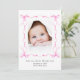 Charmant et unique faire-part de naissance de petite fille avec sa photo dans un cadre d'aquarelle rose composé de rubans et des arcs de coquette et son nom et statistiques de naissance dans la typographie serif classique. Au verso, ajoutez une photo supplémentaire et votre message personnalisé à votre famille et à vos amis.